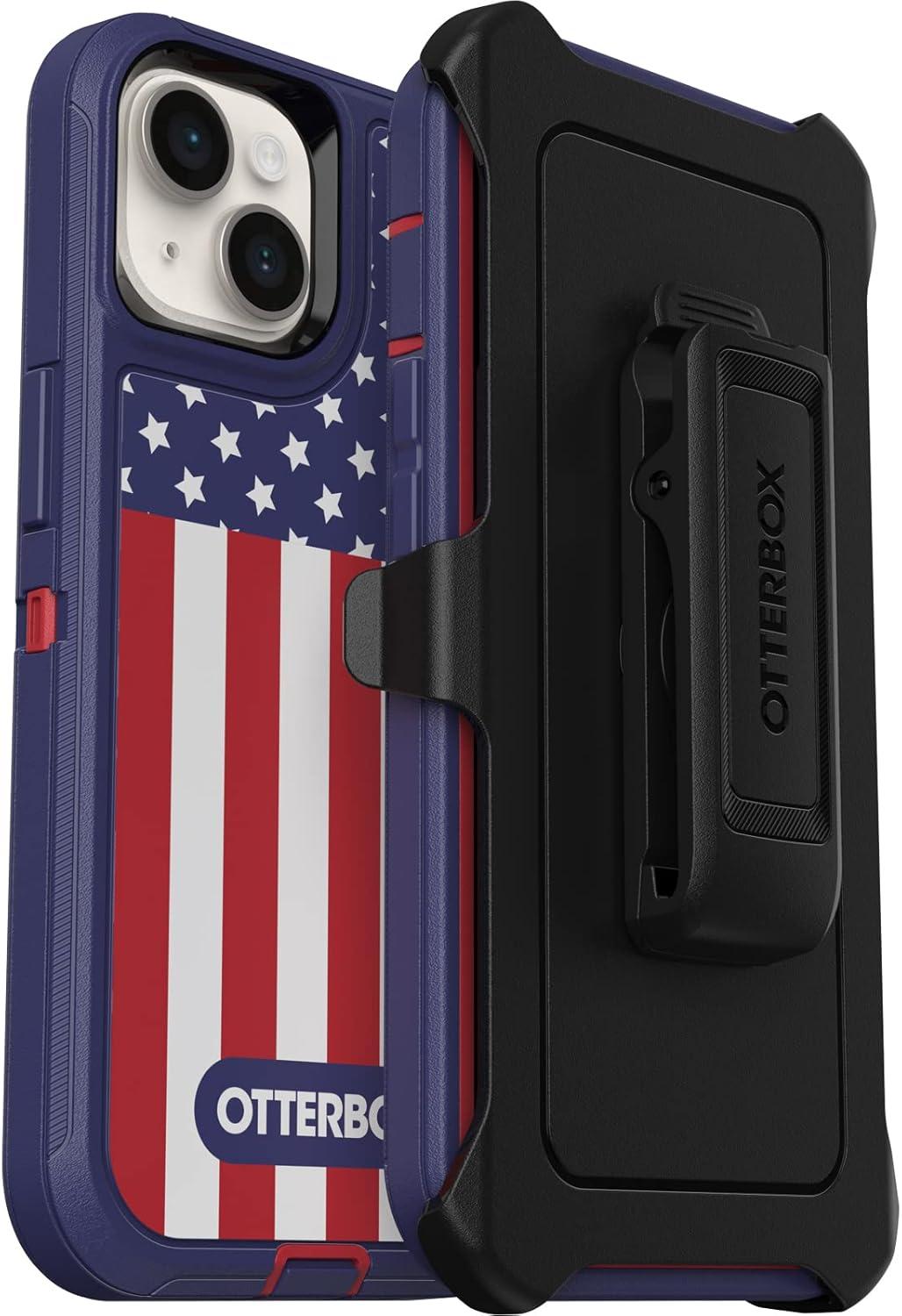 OtterBox iPhone 14 & iPhone 13 Defender Series Case – RAIN Check (Blue), Rugged & Durable, with Port Protection, Includes Holster Clip Kickstand(American Flag)
