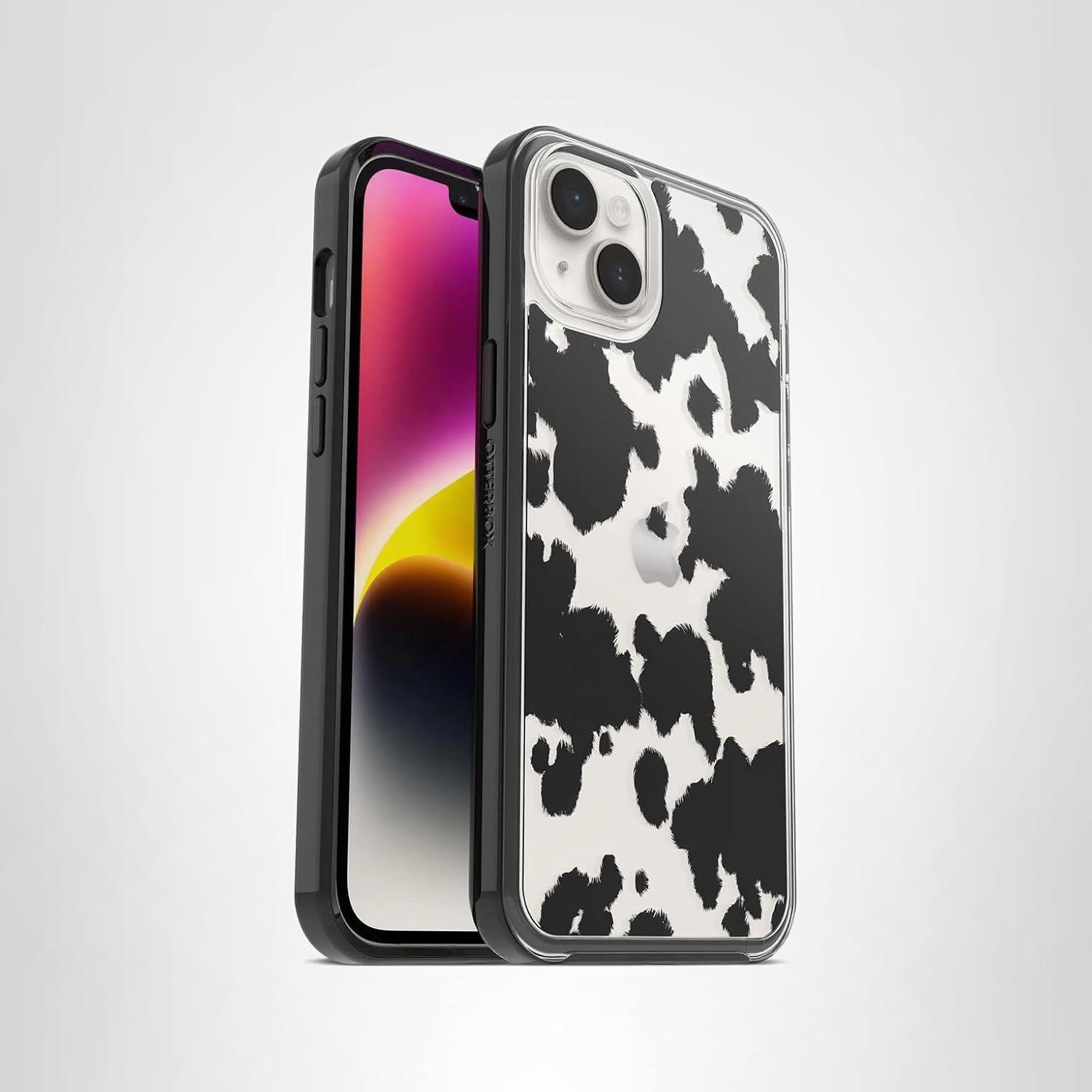 OtterBox iPhone 14 Plus Symmetry Series Case – STARDUST (Clear/Glitter), Ultra-Sleek, Wireless Charging Compatible, Raised Edges Protect Camera & Screen(Cow Print)
